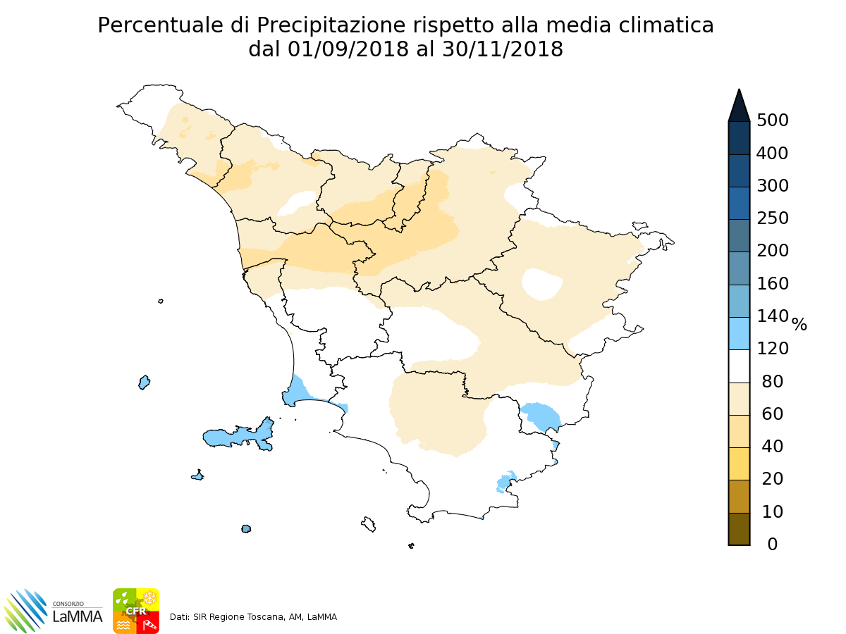 Pubblichiamo una sintetica analisi sull'andamento meteo dell'autunno appena trascorso che, rispetto alla media di riferimento, è stato mite e poco piovoso. TEMPERATURE Quello che abbiamo appena trascorso è stato, a pari merito con il 2014, l’autunno più caldo a partire dal 1955. Mediando i dati delle stazioni meteorologiche di Firenze, Arezzo, Grosseto e Pisa, nel periodo 1° settembre - 30 novembre (autunno meteorologico e climatologico), la temperatura media è stata di 1.8 °C superiore ai valori “normali” del periodo 1981-2010 (+2.2 °C l’anomalia rispetto agli autunni del periodo 1971-2000). Anomalia di temperatura media AUTUNNO dal 1955 al 2018 Anomalia di Temperatura media Autunno 2018 Più alta l’anomalia delle temperature massime rispetto alle minime (rispettivamente +2.0 °C e +1.4 °C). Il mese più caldo dei tre è stato ottobre che ha chiuso con una anomalia di +1.9 °C. Come mostra l’immagine sottostante, relativa all’andamento delle anomalie di temperatura giornaliere, il giorno che ha mostrato lo scarto positivo più marcato è stato il 27 ottobre, con 6.7 gradi sopra la media; il 26 settembre si è distinto per la maggior anomalia negativa, e cioè 3.4 gradi sotto la media. Caldo decisamente anomalo nella seconda parte di settembre e nella prima quindicina di novembre, pochi episodi invece di temperatura sotto la media. Il giorno più caldo in assoluto dell’autunno 2018 è stato il 24 settembre, mentre il giorno più freddo il 30 novembre; rispettivamente in queste due giornate la temperatura media è stata di 24.3 °C e 5.8 °C. PRECIPITAZIONI E’ stato un autunno con meno pioggia del normale e un po’ meno giorni piovosi nella norma al centro-nord; piogge e giorni piovosi nel complesso in media sulla costa meridionale e le isole. Mediamente, nei capoluoghi, è stato osservato un deficit del 30-35%; inferiore alla norma anche il numero dei giorni piovosi (vale a dire con almeno 1 mm di pioggia). Ad un settembre particolarmente secco, è seguito un mese di ottobre con piogge nella media (ma concentrate in pochi giorni) e un mese di novembre con precipitazioni al di sotto della norma. Nei capoluoghi l’anomalia pluviometrica è risultata particolarmente marcata a Firenze, Prato, Pisa, Pistoia, Massa-Carrara (rispettivamente deficit del 51, 48, 47, 37, 34 %); deficit meno pronunciati altrove. Anomalie di precipitazione nei capoluoghi toscani - Autunno 2018 Percentuale di precipitazione rispetto alla media CURIOSITÀ: il giorno più piovoso e con più fulmini è stato il 29 ottobre quando sono caduti diffusamente tra 30 e 60 mm e sono caduti circa 12000 fulmini.