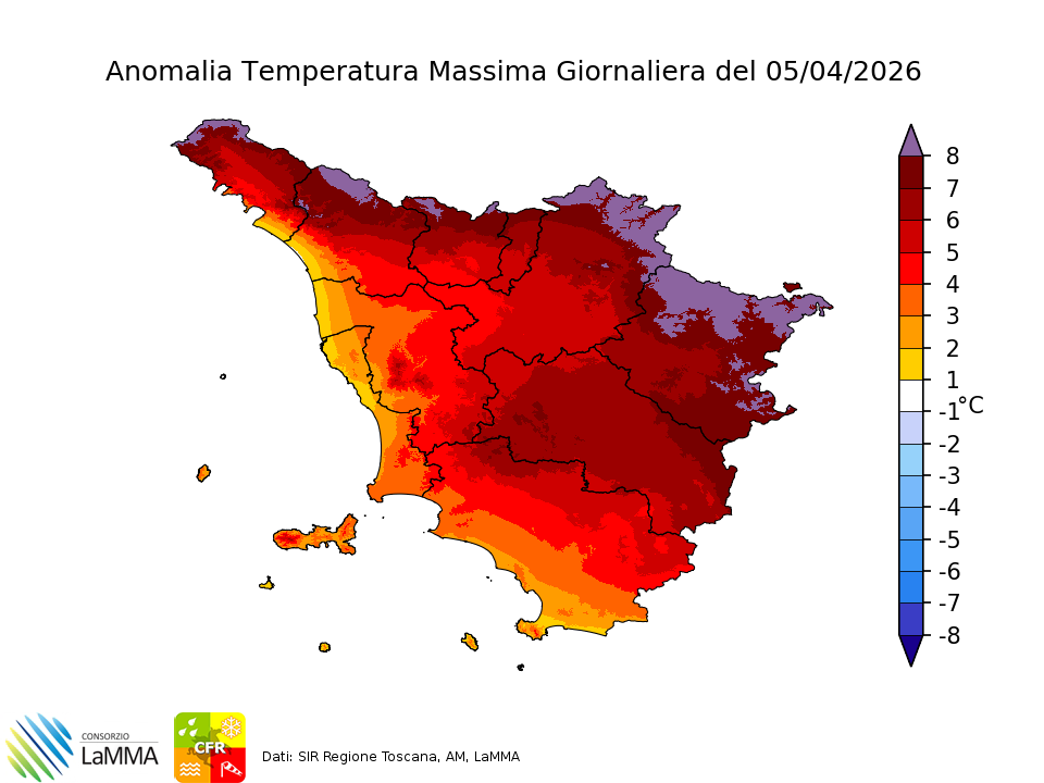 Secondo l'ultimo aggiornamento delle previsioni stagionali nel mese di Maggio non sono previste particolari anomalie nè a livello termico nè pluviometrico. Tuttavia a livello di circolazione sono previste una maggiore frequenza di un tipo di circolazione settentrionale (tipi di tempo 1-2) e minor presenza dell'anticiclone (tipi di tempo 4-5). Questo determinerà temperature allineate alle medie stagionali (climatologia 1981-2010) e condizioni temporaneamente instabili.