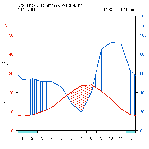Grosseto (dati Servizio Meteorologico Aeronautica Militare) Lat: 42.75; Long: 11.07; quota: 5 m slm Vai a climatologia 1981-2010Vai a climatologia 1991-2020 GROSSETO CLIMA 1971-2000 Gen Feb Mar Apr Mag Giu Lug Ago Set Ott Nov Dic ANNO Tmin 1 decade 2,5 2,7 3,6 6,6 9,1 12,8 16,2 17,8 15,1 12,4 8,0 4,1 Tmin 2 decade 2,7 2,7 4,1 5,8 10,2 13,7 16,8 17,6 14,6 11,5 6,5 3,5 Tmin 3 decade 2,8 2,9 5,3 7,2 11,2 14,9 17,2 16,7 13,9 9,4 4,6 3,3 Tmin MEDIA (°C) 2,7 2,8 4,4 6,5 10,2 13,8 16,8 17,3 14,6 11,1 6,4 3,6 9,2 Dev. Std. Tmin (°C) 1,7 1,8 1,5 1,1 1,1 1,1 1,1 0,8 1,2 1,5 1,5 1,6 1,3 Tmax 1 decade 11,9 13,4 14,4 17,2 20,9 25,7 29,4 31,3 27,5 23,1 18,0 13,2 Tmax 2 decade 12,3 12,9 15,7 17,3 22,6 26,5 30,1 31,0 26,6 21,9 16,2 13,3 Tmax 3 decade 12,8 13,5 16,2 18,7 24,0 27,8 30,9 29,1 25,1 19,7 14,2 12,5 Tmax MEDIA (°C) 12,4 13,2 15,5 17,8 22,6 26,7 30,1 30,4 26,4 21,5 16,1 13,0 20,5 Dev. Std. Tmax (°C) 1,3 1,4 1,4 1,0 1,7 1,3 1,4 1,7 1,7 1,4 1,2 1,0 1,4 Tmed 1 decade 7,2 8,0 9,0 11,9 15,0 19,3 22,8 24,5 21,3 17,8 13,0 8,6 Tmed 2 decade 7,5 7,8 9,9 11,6 16,4 20,1 23,5 24,3 20,6 16,7 11,3 8,4 Tmed 3 decade 7,8 8,2 10,8 13,0 17,6 21,3 24,0 22,9 19,5 14,6 9,4 7,9 Tmed MEDIA (°C) 7,5 8,0 9,9 12,1 16,4 20,2 23,4 23,9 20,5 16,3 11,3 8,3 14,8 Dev. Std. Tmed (°C) 1,4 1,4 1,3 0,9 1,3 1,1 1,2 1,1 1,3 1,3 1,2 1,2 1,2 Pioggia (mm.) 52,2 54,5 51,2 51,0 38,9 27,8 18,6 39,7 84,4 91,7 90,9 62,4 663,3 Giorni di pioggia 6,6 6,0 6,7 7,9 5,8 3,7 2,1 3,1 5,0 7,2 8,5 7,4 70,0 ESTREMI TERMICI anno Tmin assoluta -13,2 11/01/85 Tmax assoluta 39,2 16/08/74 giorni ghiaccio totali 0 giorni ghiaccio max 0 giorni gelo medi 23 giorni gelo max 49 1981 giorni T>34°C medi 5 giorni T>34°C max 16 1971 indice continentalità 16,4 ESTREMI PLUVIOMETRICI media massima anno minima anno Anno 663 965 1987 450 1988 Primavera 141 216 1985 40 1973 Estate 86 211 1983 16 1971 Autunno 267 551 1987 97 1988 Inverno 169 321 1986 10 1992 Mesi Ondate di calore MAM GLA SON DGF anno giorni T>34 1971 0 0 0 0 0 16 1972 0 0 0 0 0 3 1973 0 0 0 0 0 4 1974 0 0 0 0 0 7 1975 0 0 0 0 0 2 1976 0 0 0 0 0 0 1977 1 0 0 0 1 0 1978 0 0 0 0 0 0 1979 0 0 0 0 0 0 1980 0 0 0 0 0 0 1981 2 0 0 0 2 6 1982 0 1 0 0 1 5 1983 0 1 0 0 1 9 1984 0 0 0 0 0 0 1985 0 0 0 0 1 5 1986 1 0 0 1 1 1 1987 0 0 2 0 2 9 1988 0 0 1 0 1 10 1989 0 1 0 1 3 4 1990 0 0 0 1 0 6 1991 1 0 0 0 1 2 1992 0 1 0 0 1 11 1993 0 0 0 0 0 4 1994 0 0 0 1 1 12 1995 0 1 0 0 1 7 1996 0 1 1 0 2 5 1997 0 0 2 0 2 4 1998 1 0 0 0 1 12 1999 1 0 1 0 2 4 2000 0 2 0 0 2 13 Totale 7 8 7 4 26 5 Mesi Ondate di freddo MAM GLA SON DGF anno giorni gelo 1971 1 0 0 0 1 17 1972 0 0 1 0 1 7 1973 0 0 0 0 1 37 1974 0 0 2 1 2 12 1975 0 1 0 0 1 14 1976 0 2 1 0 3 14 1977 0 0 1 0 1 6 1978 0 1 0 0 1 15 1979 0 0 0 1 1 16 1980 2 1 0 0 3 21 1981 0 2 1 1 4 49 1982 0 0 0 0 0 22 1983 0 1 0 0 1 27 1984 0 2 0 1 3 22 1985 0 0 0 1 1 19 1986 0 0 0 1 1 27 1987 1 0 0 0 1 34 1988 0 0 0 0 0 22 1989 0 0 1 0 1 33 1990 0 0 0 0 0 18 1991 2 1 1 2 7 41 1992 0 1 0 1 1 13 1993 0 0 1 1 2 40 1994 1 0 0 0 1 15 1995 0 0 0 0 0 31 1996 0 1 0 0 1 25 1997 0 0 0 0 0 7 1998 0 0 0 0 0 24 1999 0 0 0 0 0 47 2000 0 1 0 0 1 20 Totale 7 14 9 10 40 23 Legenda