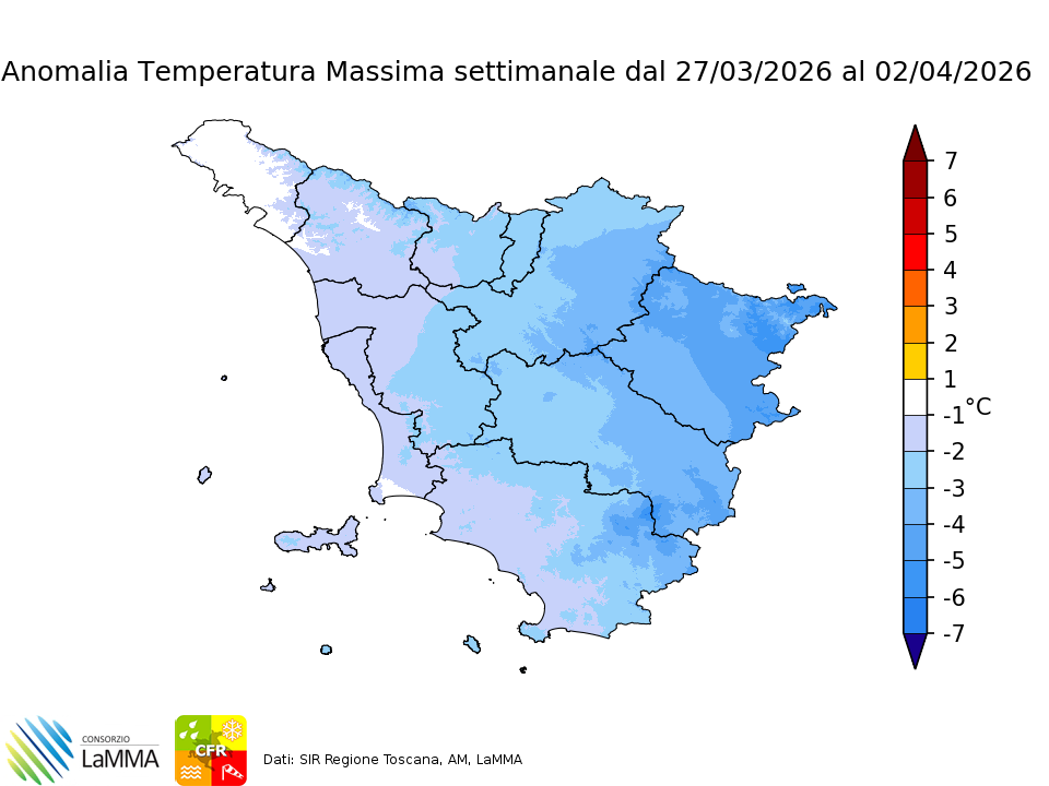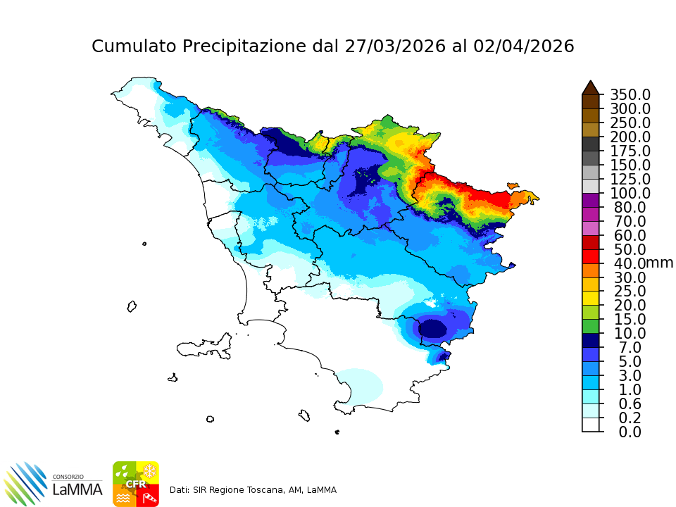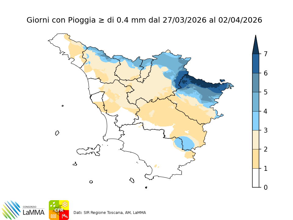 Per motivi tecnici consultare il bollettino fito-sanitario a questo indirizzo Aggiornato il 03/04/2026 Il bollettino agrometeorologico viene aggiornato una volta la settimana (giovedì). Per informazioni meteorologiche più aggiornate consultare il bollettino Lamma Osservazioni meteo e anomalie Previsioni e tendenza meteo Bollettino fitosanitario Legenda Prato: Osservazioni della settimana da 27/03/2026 a 02/04/2026 test Mappe di scostamento dalle medie delle temperature (rosso = più caldo del normale; blu = più freddo del normale) Mappe del numero dei giorni piovosi e del cumulato di pioggia in mm Temperature registrate nell’ultima settimana e precipitazioni giornaliere in alcune località rappresentative della provincia di Prato Valori giornalieri - Tmin (°C) / Tmax (°C)Pioggia (mm) Valori medi settimanali eCumulato pioggia ven 27sab 28dom 29lun 30mar 31mer 01gio 02 Settimana Artimino5.4/12.60.01.9/18.10.03.1/16.10.03.7/17.41.85.1/13.61.68.9/11.40.09.9/14.30.05.4/14.83.4 n.d. = dato non disponibile * = valore calcolato tramite dati settimanali non completi Tempo previsto nei prossimi 2 giorni sabato 04/04/2026 Stato del cielo e fenomeni: sereno o poco nuvoloso. Venti: deboli da nord est. Fino a moderati di Maestrale nel pomeriggio lungo la costa. Temperature: minime in sensibile calo, massime in ulteriore aumento nelle zone interne con punte di 22-23 °C (lieve calo invece lungo la costa). domenica 05/04/2026 Stato del cielo e fenomeni: sereno o poco nuvoloso. Venti: deboli occidentali con rinforzi nel pomeriggio. Temperature: in aumento, punte di 23-25 gradi. Segnalazioni nulla da segnalare Previsione per sabato 04/04/2026 mattina pomeriggio sera Previsione per domenica 05/04/2026 mattina pomeriggio sera Tendenza lunedì 06/04/2026 Stato del cielo e fenomeni: poco nuvoloso per transito di nuvolosità in prevalenza medio-alta. Possibili banchi di nebbia o nubi basse fino alle prime ore del mattino sul Valdarno Inferiore e Medio. Venti: deboli in prevalenza occidentali con rinforzi pomeridiani. Temperature: quasi stazionarie o in lieve calo. martedì 07/04/2026 Stato del cielo e fenomeni: sereno o poco nuvoloso. Possibili nubi basse fino alle prime ore del mattino su Valdarno Inferiore e Medio. Venti: deboli. Temperature: stazionarie. Giorni successivi: soleggiato Segnalazioninulla da segnalare Per approfondimenti collegarsi a: agroambiente.info.regione.toscana.it Il bollettino viene aggiornato una volte la settimana, il giovedì. Sezione osservazioni Nelle mappe di "scostamento dalle medie delle temperature", le tonalità dal celeste al blu della legenda indicano di quanti gradi le temperature del giorno o della settimana considerate (vedi periodo indicato sulla mappa) sono risultate più fredde di quelle mediamente registrate negli stessi periodi degli ultimi 20 anni, la colorazione in bianco indica che le temperature sono risultate in linea con quelle degli ultimi 20 anni, mentre le tonalità dall'arancio al rosso indicano di quanti gradi le temperature del giorno o della settimana considerate (vedi periodo indicato sulla mappa) sono risultate più calde di quelle mediamente registrate negli stessi periodi degli ultimi 20 anni". Nelle "Mappe del numero dei giorni piovosi" le colorazioni riportate in legenda indicano il numero di giorni con pioggia superiore a 0,4 mm nella settimana considerata (vedi periodo riportato sulla mappa); nelle "Mappe del cumulato di pioggia" le colorazioni riportate in legenda indicano i mm di pioggia caduti nella settimana considerata (vedi periodo riportato sulla mappa). Fonte dati: Servizio Idrologico Regione Toscana e rete di monitoraggio Agromabientale Regione Toscana Sezione previsioni Sulle mappe di previsione viene riportata la probabilità di precipitazioni accanto ai simboli con le lettere A (alta) M (media), B (bassa). Per probabilità bassa si intende un valore tra 20% e 40%, media tra 40% e 70%, alta oltre 70%.. La legenda dei simboli si può consultare qui.