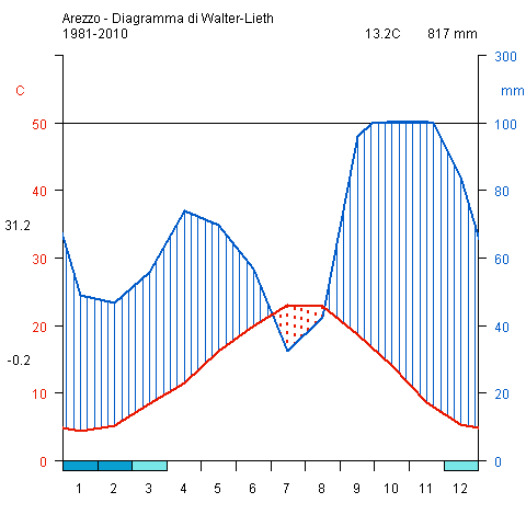 Arezzo Molin Bianco (dati Servizio Meteorologico Aeronautica Militare) Lat: 43.47; Long: 11.87; quota: 250 m slm Vai a climatologia 1971-2000Vai a climatologia 1991-2020 AREZZO CLIMA 1981-2010 Gen Feb Mar Apr Mag Giu Lug Ago Set Ott Nov Dic ANNO Tmin 1 decade -0,1 -0,4 1,7 4,5 7,8 11,6 14,3 15,2 12,2 9,8 5,1 1,9 Tmin 2 decade -0,4 -0,4 2,1 4,6 9,4 12,3 14,4 14,8 11,4 8,0 3,5 0,6 Tmin 3 decade -0,2 0,4 3,5 6,3 10,1 13,5 15,4 14,2 10,6 7,2 2,8 0,7 Tmin MEDIA (°C) -0,2 -0,2 2,4 5,2 9,1 12,5 14,7 14,7 11,4 8,3 3,8 1,1 6,9 Dev. Std. T min (°C) 1,9 1,7 1,7 1,1 1,3 1,4 1,2 1,2 1,2 1,7 1,6 1,8 1,5 Tmax 1 decade 8,7 10,6 12,4 17,1 21,6 25,8 30,3 31,8 27,2 21,9 15,5 10,4 Tmax 2 decade 9,0 10,1 14,3 16,9 23,1 27,0 30,8 31,5 25,9 20,3 13,4 9,4 Tmax 3 decade 9,3 11,3 15,1 19,8 24,9 29,1 32,5 29,8 24,0 17,7 11,4 8,9 Tmax MEDIA (°C) 9,0 10,6 14,4 17,9 23,3 27,3 31,2 31,0 25,7 19,9 13,4 9,6 19,4 Dev. Std. T max (°C) 1,4 2,2 2,1 1,5 2,2 1,8 1,7 2,1 1,9 1,3 1,2 1,2 1,7 Tmed 1 decade 4,3 5,1 7,2 10,9 14,7 18,7 22,3 23,5 19,7 15,8 10,3 6,2 Tmed 2 decade 4,3 4,8 8,5 10,8 16,2 19,6 22,6 23,2 18,6 14,1 8,5 5,0 Tmed 3 decade 4,6 5,9 9,5 13,0 17,5 21,3 23,9 22,0 17,3 12,4 7,1 4,8 Tmed MEDIA (°C) 4,4 5,4 8,5 11,8 16,3 19,9 23,0 22,7 18,3 13,9 8,5 5,4 13,2 Dev. Std. T med (°C) 1,6 1,8 1,8 1,6 1,8 1,6 1,3 1,7 1,6 1,7 1,5 1,5 1,6 Pioggia (mm.) 49 47 56 74 70 57 32 43 96 106 104 84 817 Giorni di pioggia 6,5 6,7 7,3 9,3 8,5 6,6 3,5 4,3 7,3 8,5 9,2 8,7 86,3 ESTREMI TERMICI anno Tmin assoluta -20,2 11/01/85 Tmax assoluta 40,3 26/07/83 giorni ghiaccio totali 15 giorni ghiaccio max 7 1985 giorni gelo medi 59 giorni gelo max 80 1981 giorni T>34°C medi 15 giorni T>34°C max 57 2003 indice continentalità 18,6 ESTREMI PLUVIOMETRICI media massima anno minima anno Anno 817 1071 1992 510 2007 Primavera 200 309 2003 129 1984 Estate 132 311 1988 44 1989 Autunno 306 592 1983 93 1993 Inverno 179 342 1990 31 2010 Mesi Ondate di calore MAM GLA SON DGF anno 1981 1 0 0 0 1 1982 0 0 0 0 0 1983 0 1 0 0 1 1984 0 0 0 0 0 1985 0 0 0 0 0 1986 1 0 0 0 1 1987 0 0 2 0 2 1988 0 0 1 0 1 1989 1 0 0 0 2 1990 0 0 1 1 1 1991 0 0 0 1 1 1992 0 0 1 0 1 1993 0 0 0 0 0 1994 0 1 0 0 1 1995 0 0 0 0 1 1996 0 1 1 1 2 1997 0 0 1 0 1 1998 0 1 0 0 1 1999 0 0 0 0 0 2000 0 0 0 0 0 2001 2 0 0 0 2 2002 0 1 0 0 1 2003 1 5 0 0 6 2004 0 0 1 0 1 2005 0 1 0 0 1 2006 0 1 1 0 2 2007 2 2 0 2 6 2008 0 1 0 0 1 2009 2 2 1 0 5 2010 0 1 0 0 1 Totale 10 18 10 5 43 Mesi Ondate di freddo MAM GLA SON DGF anno 1981 0 2 1 1 4 1982 1 0 0 0 1 1983 1 1 0 0 2 1984 2 2 1 1 6 1985 0 0 0 1 1 1986 0 0 0 0 1 1987 1 0 0 1 1 1988 1 0 0 0 1 1989 0 0 2 0 2 1990 1 0 0 0 1 1991 2 0 1 2 6 1992 0 1 0 1 1 1993 0 0 0 0 0 1994 1 0 0 0 1 1995 0 0 0 0 0 1996 0 1 0 0 1 1997 0 0 0 0 0 1998 0 0 0 0 0 1999 0 0 0 0 0 2000 0 1 0 0 1 2001 0 0 1 0 1 2002 0 0 0 0 0 2003 0 0 0 0 0 2004 0 0 0 0 0 2005 1 0 0 0 1 2006 0 0 0 0 0 2007 0 0 0 0 0 2008 0 0 1 0 1 2009 0 0 0 1 1 2010 1 1 0 0 2 Totale 12 9 7 8 36 Dettaglio Media temperatura media 1 2 3 4 5 6 7 8 9 10 11 12 g_gelo g_T>34 1981 1,1 3,5 9,5 12,7 15,0 19,3 20,4 21,4 18,8 13,9 5,9 5,8 80 3 1982 5,1 4,3 6,4 9,8 14,7 20,5 23,6 20,9 19,8 13,0 8,8 6,1 71 5 1983 5,1 2,9 8,7 11,5 14,6 18,2 23,8 22,1 19,5 13,4 7,1 4,9 70 15 1984 4,2 3,5 6,3 10,4 13,0 17,6 21,1 19,8 16,3 13,8 10,2 5,9 58 3 1985 1,0 4,9 7,8 11,2 15,6 18,4 23,6 22,6 20,4 14,2 8,6 6,3 55 18 1986 3,8 2,8 7,8 10,9 18,0 18,2 21,4 22,6 18,6 14,1 7,8 2,9 72 0 1987 3,6 5,6 4,1 11,4 13,9 18,6 23,5 22,8 21,0 15,4 8,9 6,1 60 2 1988 6,6 5,7 7,5 11,9 17,0 18,5 24,0 23,9 18,6 16,0 6,5 4,6 56 25 1989 3,8 7,0 10,7 11,4 15,0 18,0 21,3 21,5 17,3 11,8 7,8 6,4 64 0 1990 3,7 8,4 9,9 10,6 16,2 19,6 22,7 22,1 18,7 16,9 9,8 4,6 50 7 1991 4,8 4,1 10,9 9,8 12,2 18,7 23,2 24,3 20,6 12,5 7,3 1,8 73 20 1992 4,7 5,3 7,8 12,2 17,3 18,1 21,8 23,9 19,2 13,9 10,1 6,1 53 19 1993 4,7 4,1 7,1 11,8 17,0 20,7 21,3 24,0 18,1 14,3 8,0 6,7 74 26 1994 6,6 5,9 11,5 10,6 16,4 19,9 23,4 24,9 19,2 13,3 10,1 5,9 40 22 1995 3,6 7,3 6,8 11,3 15,8 18,2 23,6 20,9 15,8 13,7 7,8 7,5 67 7 1996 6,7 4,3 6,7 11,2 15,2 19,5 21,0 20,9 15,2 12,5 9,2 4,2 50 0 1997 5,7 6,6 9,2 9,4 16,6 20,2 22,0 22,4 19,7 13,5 9,3 5,9 62 0 1998 5,5 7,0 7,6 11,5 16,2 20,8 24,2 24,7 18,5 14,0 7,2 3,1 70 27 1999 3,4 8,5 11,5 17,8 20,3 22,7 23,9 19,8 14,1 7,3 4,8 6,4 74 8 2000 2,8 5,9 8,4 12,9 18,0 21,3 21,7 23,4 18,8 14,7 9,9 6,8 57 16 2001 7,1 6,1 12,2 10,7 18,0 20,1 22,9 24,1 15,9 15,5 8,0 3,0 43 21 2002 2,4 7,7 10,0 11,7 16,7 21,8 22,5 21,5 17,4 14,0 11,6 7,6 41 10 2003 4,2 2,3 8,5 11,0 18,3 24,8 25,9 26,9 18,4 13,3 10,6 5,8 66 57 2004 3,7 6,1 8,1 12,3 14,8 20,5 23,3 23,7 19,2 16,6 9,2 6,6 49 11 2005 3,2 2,5 7,7 11,4 17,8 21,2 23,6 21,6 18,1 13,6 8,3 3,6 75 15 2006 3,3 5,1 7,6 13,1 16,3 20,1 24,7 21,5 19,6 15,2 8,9 7,2 47 20 2007 6,7 8,3 10,2 15,1 17,4 21,1 23,9 22,8 17,9 13,7 7,2 4,1 44 25 2008 6,5 5,9 8,9 12,2 16,8 21,2 23,0 23,3 17,4 15,4 9,1 4,9 45 13 2009 4,5 4,7 8,8 13,5 19,1 20,5 23,9 25,4 20,2 13,2 8,8 5,5 56 34 2010 3,4 5,6 7,7 11,9 15,0 20,0 24,5 22,0 17,9 12,8 9,3 4,7 52 12 Media 59 15 Dev st (tmedia) 1,6 1,8 1,8 1,6 1,8 1,6 1,3 1,7 1,6 1,7 1,5 1,5 80 57 media 4,4 5,4 8,5 11,8 16,3 19,9 23,0 22,7 18,3 13,9 8,5 5,4 media + dev st 6,0 7,1 10,3 13,4 18,1 21,5 24,3 24,4 20,0 15,6 10,0 6,8 media - dev st 2,8 3,6 6,7 10,1 14,5 18,3 21,7 21,1 16,7 12,1 7,1 3,9 Media temperatura minima 1 2 3 4 5 6 7 8 9 10 11 12 1981 -3,9 -1,7 4,6 6,1 8,2 12,4 12,6 13,5 12,2 8,4 0,1 1,7 1982 0,3 -0,8 0,5 3,6 7,2 12,9 15,7 13,1 12,9 8,0 3,5 1,9 1983 0,5 -1,4 2,8 5,5 7,3 10,6 14,6 15,0 11,9 6,6 1,5 0,7 1984 -0,6 -0,4 1,7 5,0 8,0 10,5 12,3 12,6 10,1 8,4 4,9 1,8 1985 -4,0 -0,2 3,0 5,1 9,5 10,9 14,5 13,7 10,9 7,0 4,2 2,4 1986 -0,9 -0,9 2,8 5,4 10,6 11,7 14,2 14,4 11,3 6,9 2,4 -2,0 1987 -0,6 1,4 -1,8 4,7 7,5 11,6 16,4 15,0 13,6 10,7 4,7 2,7 1988 2,4 0,5 1,4 5,8 11,3 11,4 15,2 15,5 10,7 10,1 1,1 -0,6 1989 -3,0 0,1 3,2 5,8 7,6 10,8 14,3 13,7 10,8 4,0 2,3 1,3 1990 -1,7 2,0 3,4 4,4 8,7 12,1 14,4 13,7 11,6 11,5 4,9 1,1 1991 -0,2 -1,3 4,9 3,0 5,9 11,0 14,3 15,6 13,0 6,7 3,1 -4,3 1992 0,3 -1,1 1,5 6,2 9,7 