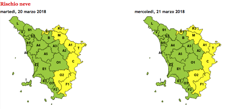 20/03/2018 - Una perturbazione in arrivo sull'Italia centrale interesserà in parte anche la Toscana, con l'ingresso di forti venti di Grecale. FENOMENI PREVISTI VENTO: dalla sera di oggi e per gran parte della giornata di domani, mercoledì, vento forte di Grecale su tutta la regione. NEVE: dalla sera di oggi e fino alle prime ore del mattino di domani, mercoledì, possibili nevicate sulle colline senesi e grossetane oltre i 5/600 metri. Al di sotto di tale quote fenomeni non significatci. Sull'Appennino aretino e fiorentino possibili accumuli oltre i 400 metri (fino al fondovalle sull'Alto Mugello). EMISSIONE ALLERTA Sulla base del quadro meteorologico previsto è stato emesso un'allerta di codice ARANCIONE per VENTO forte su tutta la Toscana da stanotte fino alle 17.00 di domani, mercoledì 21 marzo 2018, cui seguirà avviso di codice giallo fino alla mezzanotte. Si segnala anche un avviso GIALLO per NEVE sull'appennino aretino e fiorentino e su Amiata e Val d'Orcia, valido dalle 20.00 di oggi, martedì 20 marzo fino alle 06.00 di mercoledì 21 marzo 2018. Rischio Vento forte 20-21 marzo 2018 Rischio NEVE 20-21 marzo 2018 da: Allerta Meteo Regione Toscana -> Cosa significa il CODICE COLORE? GIALLO: sono possibili fenomeni occasionalmente pericolosi, in grado di causare disagi e danni a carattere locale. ARANCIO: sono previsti fenomeni molto intensi, pericolosi per l'incolumità delle persone, con danni sui beni a carattere diffuso. ROSSO: sono previsti fenomeni estremamente pericolosi per l'incolumità delle persone, in grado di causare ingenti ed estesi danni sui beni ed interruzione delle attività e dei trasporti. -> In quale area si trova il mio comune? Per sapere in quale area si trova il vostro comune, potete visitare il sito Allerta Meteo Regione Toscana; cliccando su un'area delle mappa verrà visualizzato l'elenco dei comuni compresi in quella specifica area. Per aggiornamenti e maggiori dettagli: Allerta Meteo Regione Toscana Bollettino meteo Toscana LaMMA @flash_meteo su Twitter Informazioni utili: Numero Verde Protezione Civile: 800 840 840