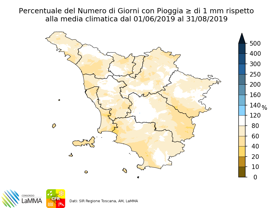 Si chiude anche l'estate 2019, ennesima estate con temperature sopra media, come molti di noi hanno percepito. Temperature Se partiamo dalla metà degli anni ’50, l’estate 2019 è risultata, mediamente, per le 4 località prese in esame (Firenze, Arezzo, Grosseto, Pisa), la quinta estate più calda: con un'anomalia di +1.4 °C rispetto al periodo 1981-2010 (+2.1 °C rispetto al periodo 1971-2000). Molto più calda l’estate 2003, leggermente più calde le estati 2015, 2012, 2017. Il mese in cui le temperature sono salite ben più della media è stato giugno, che ha fatto registrare una anomalia di +2.1 °C; a luglio la temperatura media è stata di 1.0 °C sopra i valori del periodo, dato simile a quello di agosto, +1.2 °C. La tabella riassume le anomalie di temperatura media, minima e massima (rispetto alla climatologia 1981-2010), nei 4 capoluoghi: Città T. media T. minima T. massima Arezzo +2.0 °C +2.7 °C +1.3 °C Firenze +1.6 °C +0.6 °C +2.6 °C Grosseto +1.2 °C +0.6 °C +1.8 °C Pisa +0.9 °C +0.5 °C +1.4 °C Media +1.4 °C +1.1 °C +1.8 °C Come si vede dalla tabella e dalle immagini sottostanti, sono state leggermente più alte e anomale le temperature massime. Anomalia di T. mass. estate 2019 Anomalia di T. med. estate 2019 Anomalia di T. min. estate 2019 Nella figura sotto, l'istogramma a sinistra mostra la classifica delle estati più calde dal 1955 ad oggi; le barre grigie rappresentano le estati antecedenti al 2000, quelle arancioni quelle successive al 2000, che si trovano quasi tutte nella parte alta della classifica. Il grafico colorato dell'immagine a destra mostra l’andamento giornaliero della temperatura media a Firenze e l’anomalia giorno per giorno. Come si può notare, si è registrata 1 ondata di calore di lunga durata e molto intensa tra l’ultima decade di giugno e l'inizio di luglio ed altri 3-4 episodi, seppur di breve durata, con temperatura molto sopra la media. In occasione di questa ondata di calore la stazione meteorologica di Firenze Peretola, con 39.0 °C, ha fatto registrare il record assoluto di temperatura massima per il mese di giugno. Una curiosità in più: a causa soprattutto delle temperature massime a Firenze l’estate 2019 è la seconda estate più calda a partire dal 1955. Le estati più calde dal 1955 ad oggi Andamento della T. media a Firenze e anomalia giornaliera - Estate 2019 Ondate di calore La letteratura scientifica offre diverse definizioni di ondata di calore. Qui ne abbiamo utilizzate due: Utilizzando la definizione di ondata di calore di Colacino e Conte (1998) che tiene conto anche, oltre che della temperatura massima anche della temperatura minima giornaliera, ci sono state in Toscana 1 ondata di calore di lunga durata (almeno 7 giorni consecutivi di “calore") e 3 ondate di calore di breve durata (da 3 a 6 giorni consecutivi di “calore”). Molti i giorni “di calore” o “sopra soglia”: mediamente 30 giorni nei 4 capoluoghi (sui 92 dell’intera estate): 38 a Arezzo, 33 a Firenze, 26 a Grosseto, 25 a Pisa. Utilizzando la definizione di ondata di calore che emerge dall’utilizzo dell’indice climatico WSDI (Warm Spell Duration Index) messo a punto dal CCl/WCRP/JCOMM Expert Team on Climate Change Detection and Indices (ETCCDI) e che tiene conto della temperatura massima giornaliera, 1 ondata di calore (almeno 6 giorni consecutivi sopra soglia) ha interessato la Toscana. Molti anche in questo caso i giorni “molto caldi” o sopra soglia in questa estate: mediamente 28 giorni nei 4 capoluoghi: 34 a Firenze, 19 a Arezzo, 40 a Firenze, 27 a Grosseto, 30 a Pisa. Le 3 figure seguenti mostrano il numero medio delle ondate di calore, il numero medio di giorni con temperatura sopra soglia e la durata massima media delle ondate di calore nei 4 capoluoghi dal 1955 a oggi, secondo la prima definizione di ondata di calore. Ondate di calore in estate Periodo 1955-2019 Giorni molto caldi Periodo 1955-2019 Massima durata ondata di calore Periodo 1955-2019 Si noti come, coerentemente con la tendenza all’aumento delle temperature estive osservato nelle ultime decadi, la maggioranza delle ondate di calore si sia registrata a partire dagli anni 2000. Spicca nella serie l’eccezionale estate del 2003. Piogge Complessivamente meno giorni di pioggia e anche un po’ meno pioggia del normale (deficit precipitativi nell’interno, tranne che sulle zone più orientali della regione e locali surplus sulla costa centrale; ciò connesso alla natura delle piogge estive che, essendo a prevalente carattere temporalesco, presentano quantitativi e distribuzione spaziale disomogenea e irregolare). Molto secco giugno, compensato da un mese di luglio nel quale è piovuto più del normale; mese di agosto che ha chiuso in deficit. Nei capoluoghi mediamente deficit del 10% (5-10 % di pioggia in meno in quelli del centro-nord e 45% di deficit a Grosseto). Le 4 figure seguenti mostrano, rispettivamente, l’andamento delle piogge osservate nei capoluoghi nelle estati che vanno dal 1955 al 2019, i deficit/surplus osservati nei capoluoghi nell’estate 2019, la percentuale di pioggia caduta rispetto al normale e la percentuale dei giorni piovosi rispetto al normale sul territorio. mm di pioggia nei capoluoghi (estati 1955-2019) surplus/deficit pioggia nei capoluoghi % pioggia rispetto alla media % giorni di pioggia rispetto alla media Vedi anche: Report meteo dei singoli mesi possono essere scaricati dalla sezione Report Meteorologici