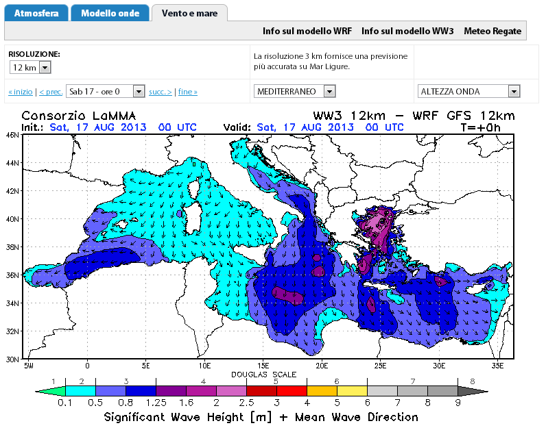 19/08/2013 - A causa di un problema tecnico, il modello Vento e Mare a risoluzione 12 Km innestato su dati WRF - GFS e il modello Onde, ad esso collegato, non hanno aggiornato le ultime corse. L'ultima corsa disponibile sul sito risulta quella delle 00.00 di sabato 17 agosto. Stiamo lavorando alla risoluzione del problema in modo che la corsa delle 12.00 UTC di oggi possa essere disponibile per la pubblicazione web entro il consueto orario delle 21.30. Ci scusiamo per il disagio.