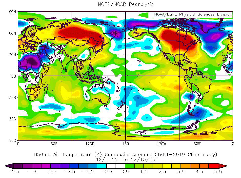 L'immagine mostra le anomalie termiche alla quota di 1500 metri (850 hPa) osservate i primi 15 giorni di Dicembre.