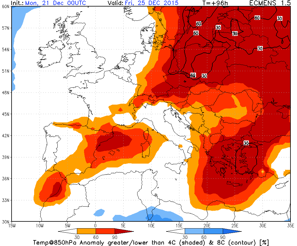 L'immagine mostra la probabilità, nel giorno di Natale, di avere in quota (850 hPa e cioè intorno a 1500 metri) temperature più alte o più basse rispetto alla norma a livello europeo.