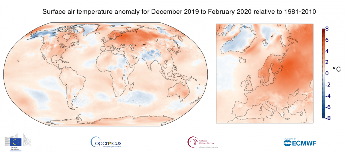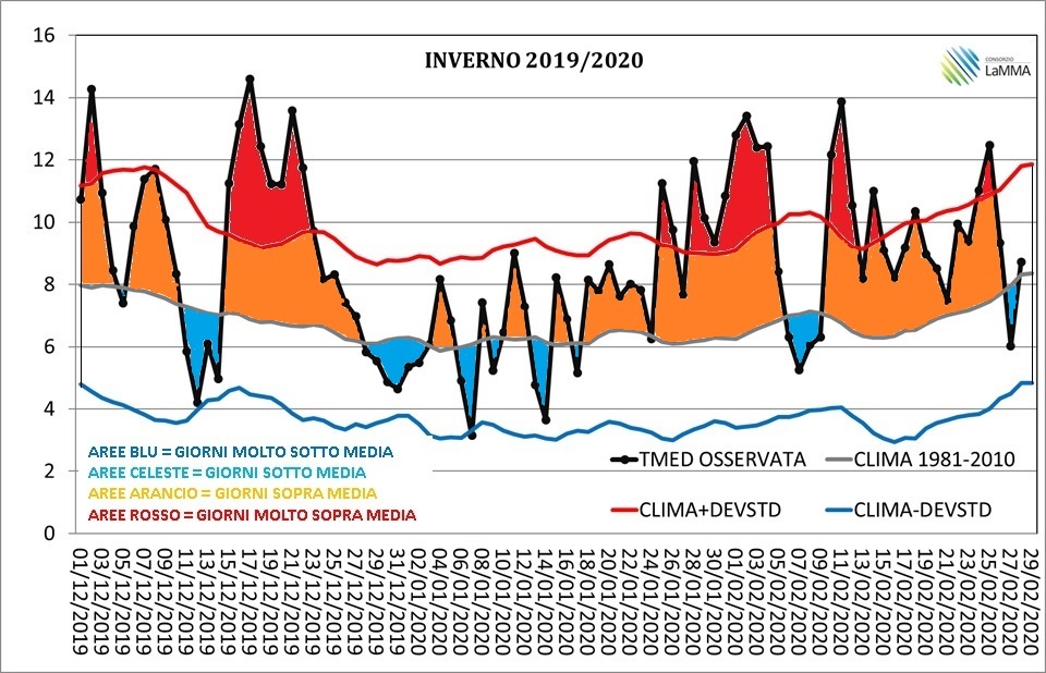 Ancora dati climatici da record e l'inverno 2019-2020 non fa eccezione. L’inverno 2019-2020 è stato in Italia il secondo inverno più caldo dal 1955 dopo il 2006-2007. Diamo uno sguardo ai dati a livello europeo e italiano, per chiudere con un approfondimento sulla Toscana. In Europa +3.4 °C rispetto alla media Secondo i dati rilasciati dal servizio climatico europeo Copernicus, l’inverno meteorologico 2019-2020, che comprende il trimestre dicembre, gennaio, febbraio, è stato il più caldo di sempre in Europa. La temperatura in media è risultata di ben 3.4 °C sopra la media del periodo 1981-2010, superando di 1.4 °C le temperature del precedente record dell'inverno 2015-2016. Febbraio 2020 è stato il secondo più caldo di sempre in Europa, battuto soltanto da quello del 1990. Rispetto alla media, la temperatura è stata più alta di 3.9 gradi: 30 anni fa si arrivò a +4.5 gradi. Fig.1 - Anomalia di temperatura inverno 2019-2020 a livello globale ed europeo - Servizio Copernicus Anche in Italia più caldo della media: + 2 °C Secondo i dati della banca dati climatologica del CNR ISAC quello appena concluso è stato per l'Italia uno degli inverni più miti e secchi da quando sono a disposizione osservazioni meteorologiche. Il trimestre invernale ha fatto registrare per l’Italia un’anomalia di +2.03 °C rispetto alla media del trentennio di riferimento 1981-2010, secondo solo all’inverno 2006/2007 (anomalia di +2.13 °C). Dicembre 2019, con un’anomalia di +1.91 °C è stato per l'Italia il secondo più caldo dal 1800 ad oggi, e febbraio 2020 risulta essere il più caldo da quando abbiamo a disposizione misure di temperatura, con un’anomalia di +2.76 °C. Fig.2 - Anomalia Temp. media - Inverno 2019-2020 Fig.3 - Anomalia Temp. Max. - Inverno 2019-2020 Sono state pesantemente sotto media le piogge; soprattutto le precipitazioni di gennaio e febbraio sono state piuttosto scarse (-68% a gennaio e -80% a febbraio). In totale nel trimestre invernale è piovuto poco più della metà di quanto piove di solito, con un -43% rispetto alla precipitazione invernale media (climatologia 1981-2010), chiudendo come l’ottavo inverno più secco dal 1800 ad oggi. Il deficit risulta più contenuta al nord (-25%) grazie alle precipitazioni delle prime decadi di dicembre, mentre sale a -55% al Sud Italia dove l’inverno appena concluso risulta il più secco da quando abbiamo a disposizione le misure. TOSCANA: temperature 2 °C sopra media Anche in Toscana i dati delle temperature si attestano in linea con quanto rilevato a livello nazionale, con un'anomalia di + 2.0 °C rispetto ai valori del periodo 1981-2010 (+1.7 °C rispetto a quella 1991-2020); più contenuta l'anomalia delle temperature minime +1.3 °C mentre le temperature massime sono state +2.6 °C sopra media. Fig.4 - Temperatura media inverni dal 1955/1956 al 2019/2020 con clima 1971-2000, 1981-2010 e 1991-2020 Fig. 5 - Anomalia di temperatura media Inverno 2019-2020 Come si vede dalla figura 4, l’anomalia termica complessiva è risultata seconda sola all’inverno 2006-2007, il più caldo della serie. Un vortice polare, eccezionalmente forte per tutto l’inverno, non ha quasi mai permesso l’ingresso di aria più fredda verso il Mediterraneo determinando prevalenti condizioni di alta pressione e temperature sopra media. Quasi nulle le precipitazioni nevose in Appennino con 55 cm di neve caduti al Passo dell’Abetone tra dicembre e febbraio che ne fanno il secondo inverno più avaro di neve a partire dal 1969/1970 dopo quello del 1989/1990, quando caddero solo 35 cm di neve. Per quanto riguarda le anomalie mensili, dicembre ha chiuso con +2,1 °C, gennaio con +1,2 °C e febbraio con addirittura +2,6 °C. Record di temperatura L'inverno appena trascorso ha battuto diversi record secondo i dati raccolti dal 1955 ad oggi. minima più alta in assoluto per il mese di dicembre a Pisa (15 °C) il giorno 17/12/2019 massime più alte in assoluto (16,4 °C e 15,7 °) per il mese di febbraio all’Abetone rispettivamente nei giorni 24 e 3 febbraio 2020 inverno 2019-2020 più caldo in assoluto all’Abetone, quasi 1 °C più caldo del 2006-2007 febbraio più caldo in assoluto all’Abetone, quasi 0,5 °C più caldo di quello del 1990 Ondate di freddo e gelate Non si sono registrate ondate di freddo, nemmeno di breve durata. Sono state invece abbastanza numerose le gelate (giorni con temperatura minima inferiore a 0 °C), soprattutto nelle pianure interne: 23 giorni a Firenze, rispetto ad una media climatica che ne conta 26, 40 ad Arezzo rispetto alle 43 attese, 15 a Grosseto rispetto alle 21 di media e solo 6 a Pisa, dove invece ne sono attese in media 23 nel corso dell'inverno. Fig.6 - Andamento giornaliero della T. media - Inverno 2019/2020 Arriva solo a 6 il numero massimo di giorni consecutivi con gelata a Firenze, registrati tra il 5 e il 10 gennaio, il record di 27 giorni consecutivi è del lontano inverno 1962-1963. Cinque i giorni consecutivi con gelata ad Arezzo. Praticamente assenti i giorni “molto freddi”, solo 2 rispetto ad una climatologia 1981-2010 che ne conta 21 ogni inverno. Per giorno molto freddo qui si intende una giornata caratterizzata da una temperatura media giornaliera inferiore di almeno una deviazione standard rispetto al normale. TOSCANA: poche precipitazioni Complessivamente circa 10% di pioggia in meno sulla Toscana, anche se ci sono state zone dove è piovuto più della media e zone nelle quali è piovuto anche meno del 60 % rispetto alla norma (figure 7 e 8). Sul nord della regione le precipitazioni sono state in linea con la media del periodo, sottomedia invece al centro-sud. L'andamento delle precipitazioni è stato condizionato dalla compattezza del vortice polare che ha fatto transitare le perturbazioni a nord dell’arco alpino determinando soprattutto minimi di pressione sul Mar Ligure, piuttosto che sul Tirreno centro-settentrionale. Fig.7 - Percentuale della pioggia attesa in Toscana Fig.8 - P