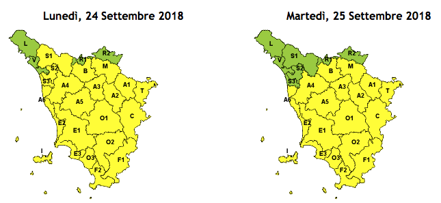 24/09/2018 - A seguito del transito di una perturbazione sui Balcani è atteso l'instaurarsi di un forte gradiente barico associato a forti venti di grecale. FENOMENI PREVISTI VENTO FORTE: Dal pomeriggio di oggi, lunedì 24 settembre, e per tutta la giornata di domani, martedì 25 settembre, venti in rinforzo di grecale con forti raffiche in particolare sui rilievi, le zone sottovento e la costa centro-meridionale. EMISSIONE ALLERTA Sulla base del quadro meteorologico previsto è stato emesso un avviso di codice GIALLO per rischio VENTO FORTE su buona parte della regione valido da lunedì 24 settembre e per tutta la giornata di domani, martedì 25 settembre 2018. Rischio VENTO FORTE da: Allerta Meteo Regione Toscana -> Cosa significa il CODICE COLORE? GIALLO: sono possibili fenomeni occasionalmente pericolosi, in grado di causare disagi e danni a carattere locale. ARANCIO: sono previsti fenomeni molto intensi, pericolosi per l'incolumità delle persone, con danni sui beni a carattere diffuso. ROSSO: sono previsti fenomeni estremamente pericolosi per l'incolumità delle persone, in grado di causare ingenti ed estesi danni sui beni ed interruzione delle attività e dei trasporti. -> In quale area si trova il mio comune? Per sapere in quale area si trova il vostro comune, potete visitare il sito Allerta Meteo Regione Toscana; cliccando su un'area delle mappa verrà visualizzato l'elenco dei comuni compresi in quella specifica area. Per aggiornamenti e maggiori dettagli: Allerta Meteo Regione Toscana Bollettino meteo Toscana LaMMA @flash_meteo su Twitter Informazioni utili: Numero Verde Protezione Civile: 800 840 840
