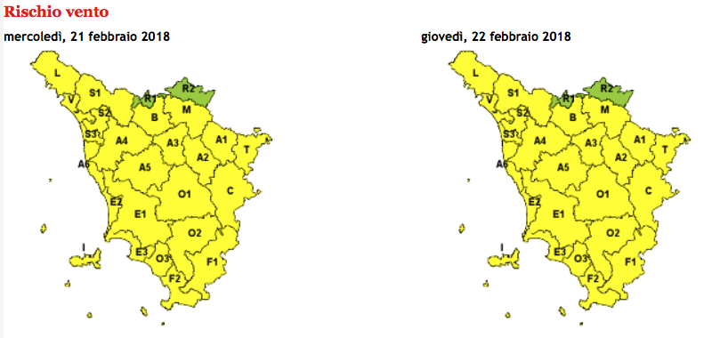 Si segnala anche un avviso GIALLO per VENTO FORTE su tutta la Toscana fino alle ore 9.00 di domani mattina, giovedì 22 febbraio 2018.