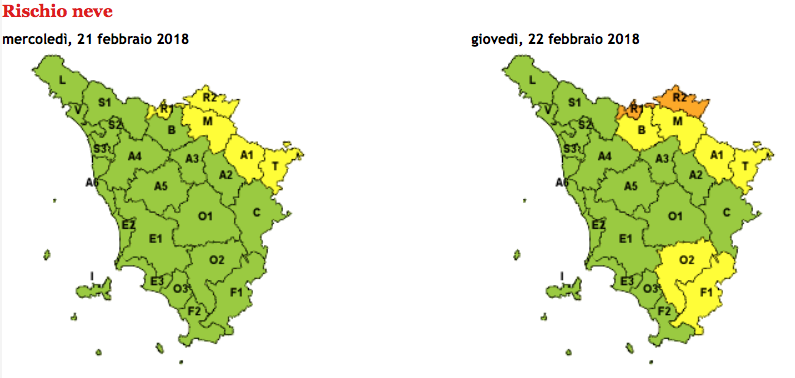 Sulla base del quadro meteorologico previsto è stato emesso un avviso di codice ARANCIONE per rischio NEVE sulla zona dell'Alto Mugello e dell'alto Appennino pistoiese valido da stanotte e per tutta la giornata di domani, giovedì 22 febbraio 2018.  Il rischio neve è invece di colore Giallo per le restanti aree della regione indicate nella mappa.