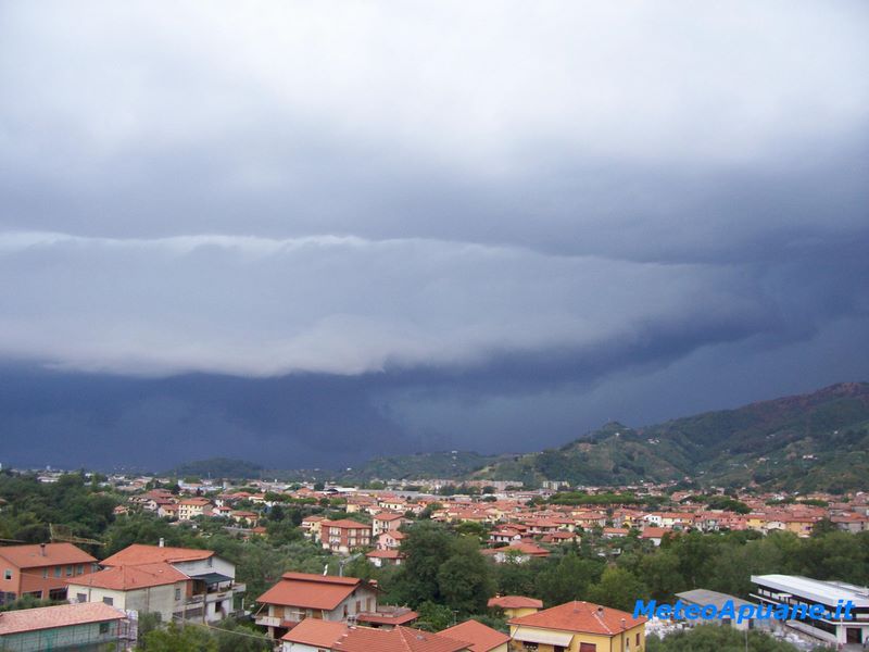 Si notano, tra le nubi plumbee, i primi forti rovesci su Sarzana e Carrara [www.MeteoApuane.it di Paolo Lunini]